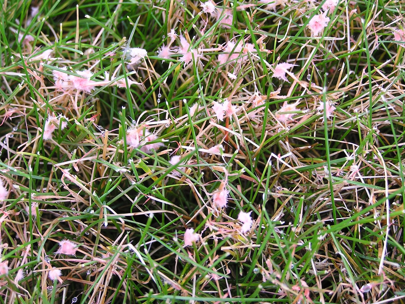 Every June, lawns all over Pennsylvania break out in a rash of red blotches. There’s no need to panic, it’s just the annual occurrence of two colorful turfgrass diseases called red thread and pink patch. Red thread is caused by Laetisaria fuciformis, a fungus that forms intertwined masses of hyphae, giving the appearance of red, thread-like strands that attach to the leaves. Pink patch is caused by Limonomyces roseipellis, and produces small wefts of pink mycelia that resemble cotton candy. Both fungi infect leaves through natural openings and mower cuts, and spread rapidly through the remainder of the plant.
